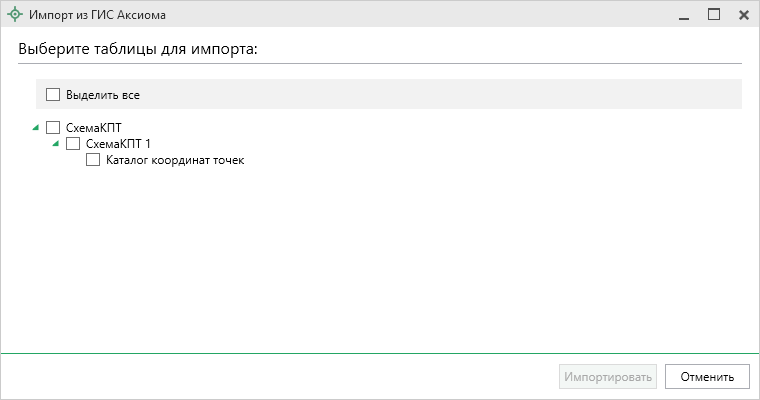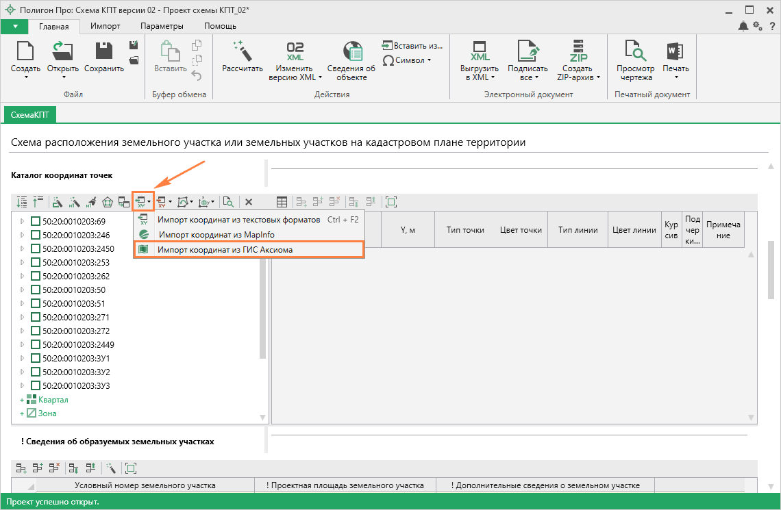- Нажмите кнопку «Импорт» и выберите из списка «Импорт координат из ГИС Аксиома»;