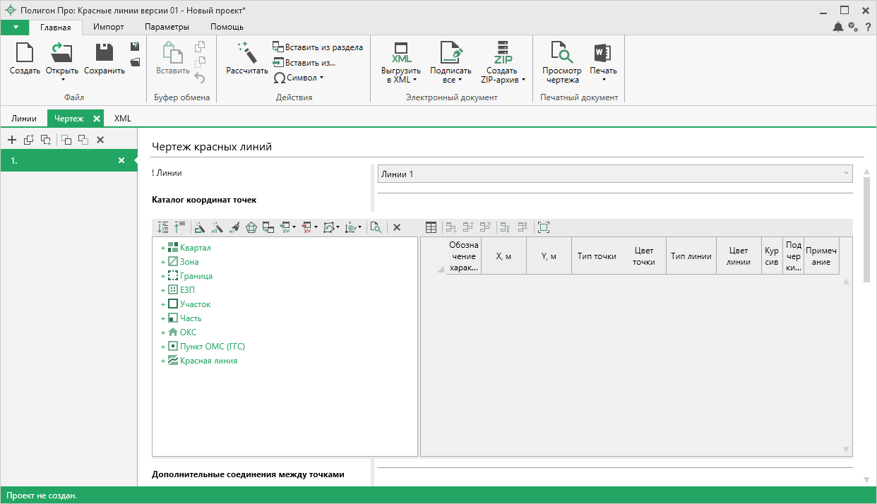 В таблице "Каталог координат точек" указываются координаты объектов, которые будут изображены на чертеже раздела.