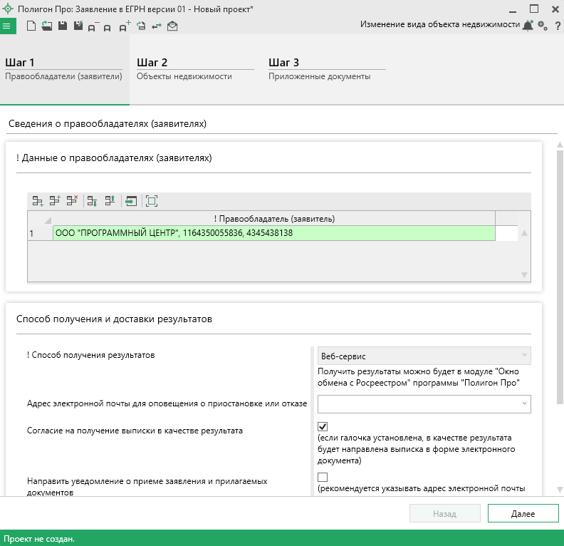 Первый шаг предназначен для внесения сведений о правообладателе (заявителе), способах получения и доставки результатов.