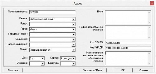 Дополнительная часть адреса, которую не удалось структурировать по КЛАДР, может быть указана в поле «Иное». В поле «Неформализованное описание» вносится установленный адрес по документу или описание местоположения в неформализованном виде, в случае если структурированный адрес отличается от адреса по документу.